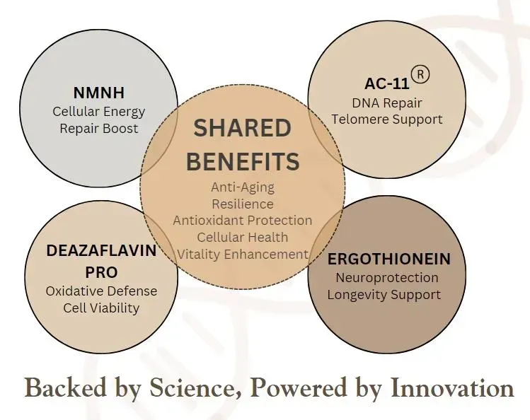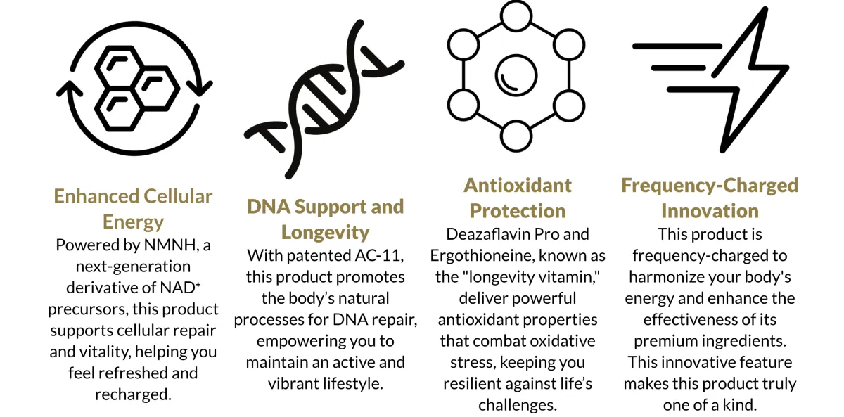 Aging is inevitable, but how you age is within your control. Introducing a groundbreaking compounded formula, exclusive to Frequense, designed to repair your DNA on every level and help you thrive at every stage of life. This is more than a simple NAD supplement—it’s a science-backed innovation. With carefully scientifically sourced, premium and patented ingredients, backed by multiple clinical studies, this product helps you live your best life by supporting cellular health and overall well-being.